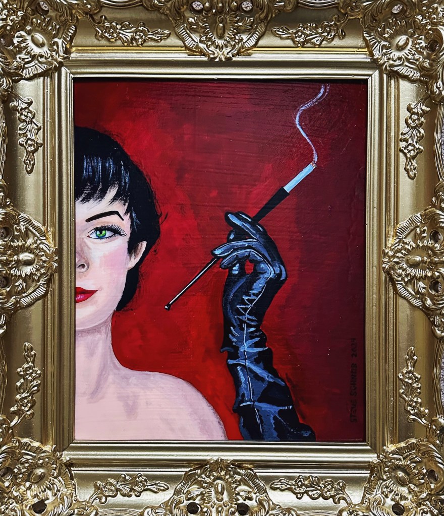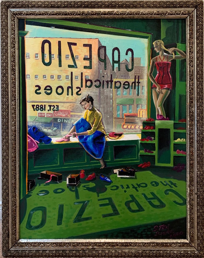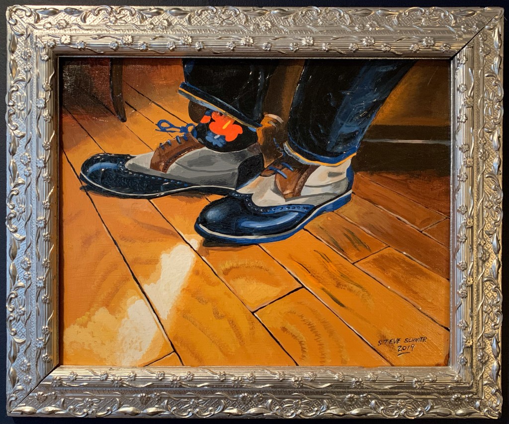 12.5” x 15.5” (image) Acrylic on wood panel in vintage frame. Steve was inspired to paint seriously after seeing Gordon Shadrach’s portraits of shoes. 2019