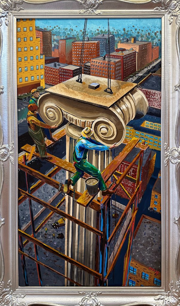 21” x 41” (image) 28” x 47” (framed) Acrylic on wood panel in vintage frame. The same worker from “Red Bandana”, now on a scaffolding, installing the columns outside the Cincinnati Court house. Based on a vintage photo. 2023