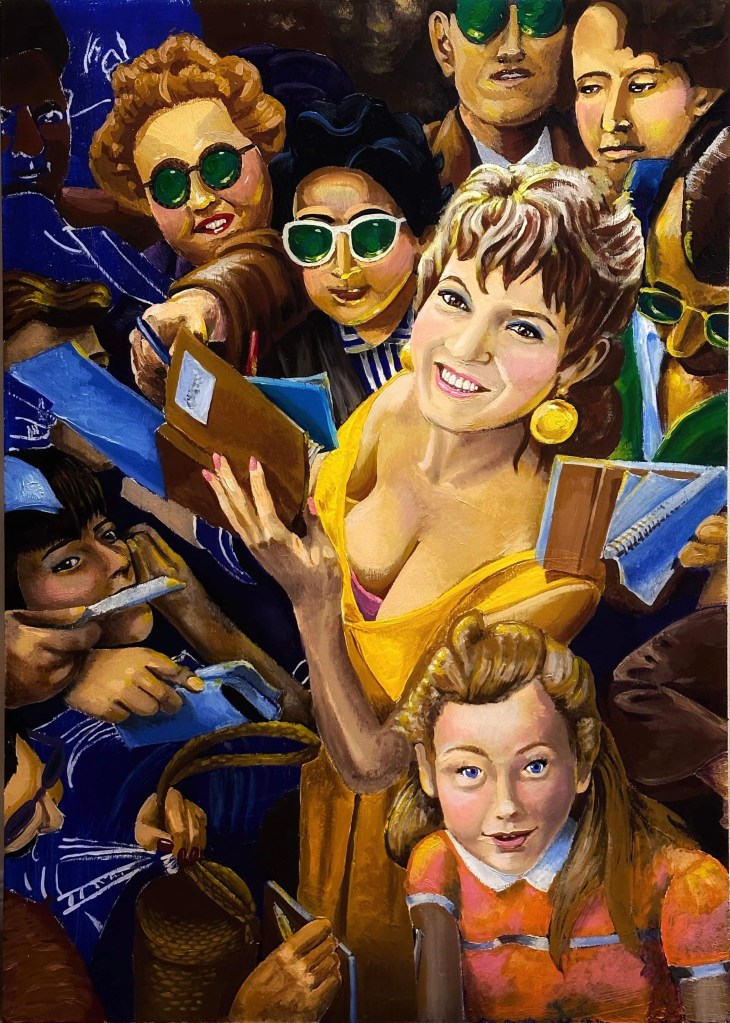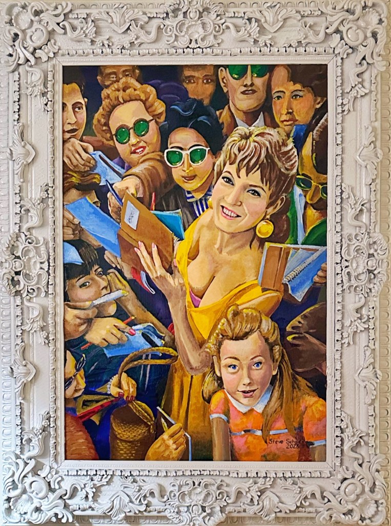 27” x 39” (image) 40” x 52” (framed) Acrylic on wood panel in vintage frame. Based on a vintage photograph of Brigitte Bardot signing autographs. 2023