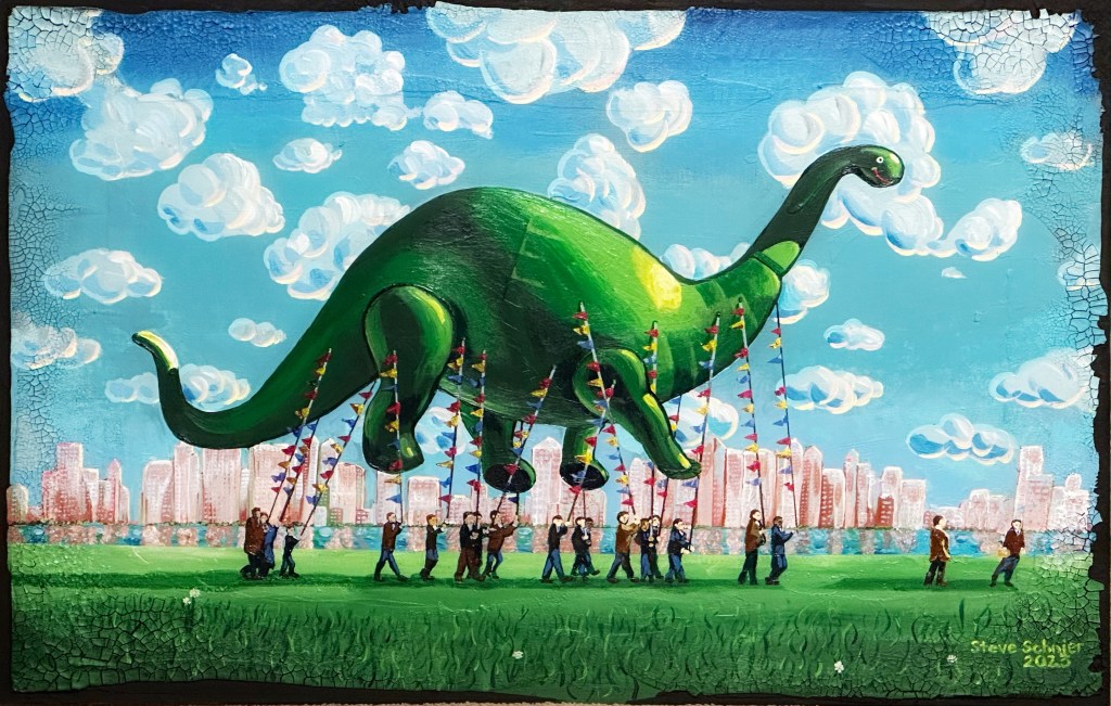 23” x 34.5” (image) 40” x 52” (framed) Acrylic on wood panel with crackle-aging technique around the edges. Based on a vintage (1964) photo of workers at the Akron, Ohio Goodyear Rubber plant, test flying a “Macy’s Thanksgiving Day Parade” balloon, sponsored by Sinclair Oil. 2023