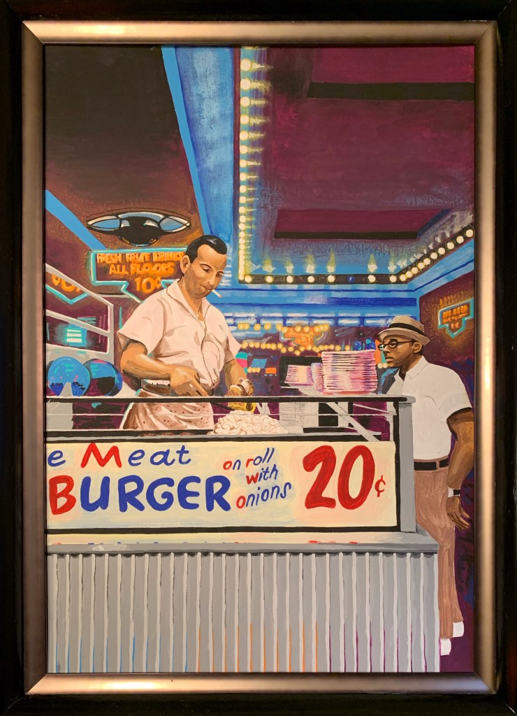 20” x 30” (image) 26” x 36” (framed) Acrylic on wood panel in vintage frame. Based on the vintage Burt Glenn “Times Square” 1959 photo series. 2020