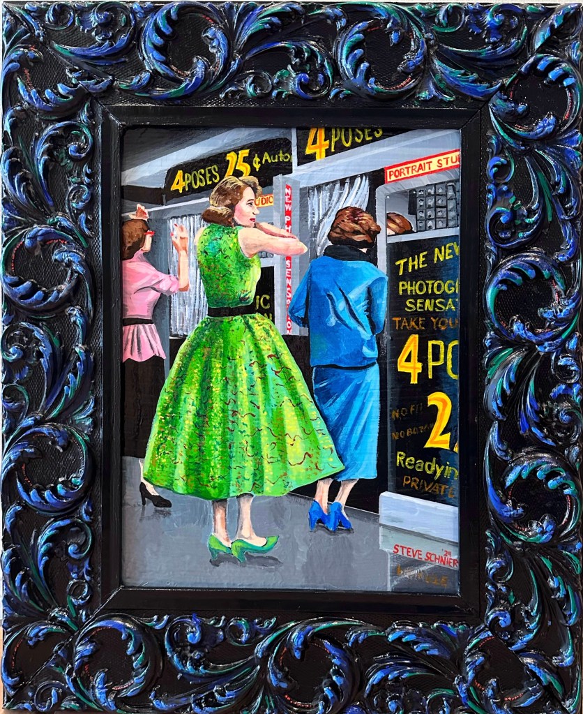 12” x 15.5 (image). Acrylic on wood panel in vintage frame. Based on a vintage (circa 1950’s) photo of women primping before taking their portraits in photo booths. 2024